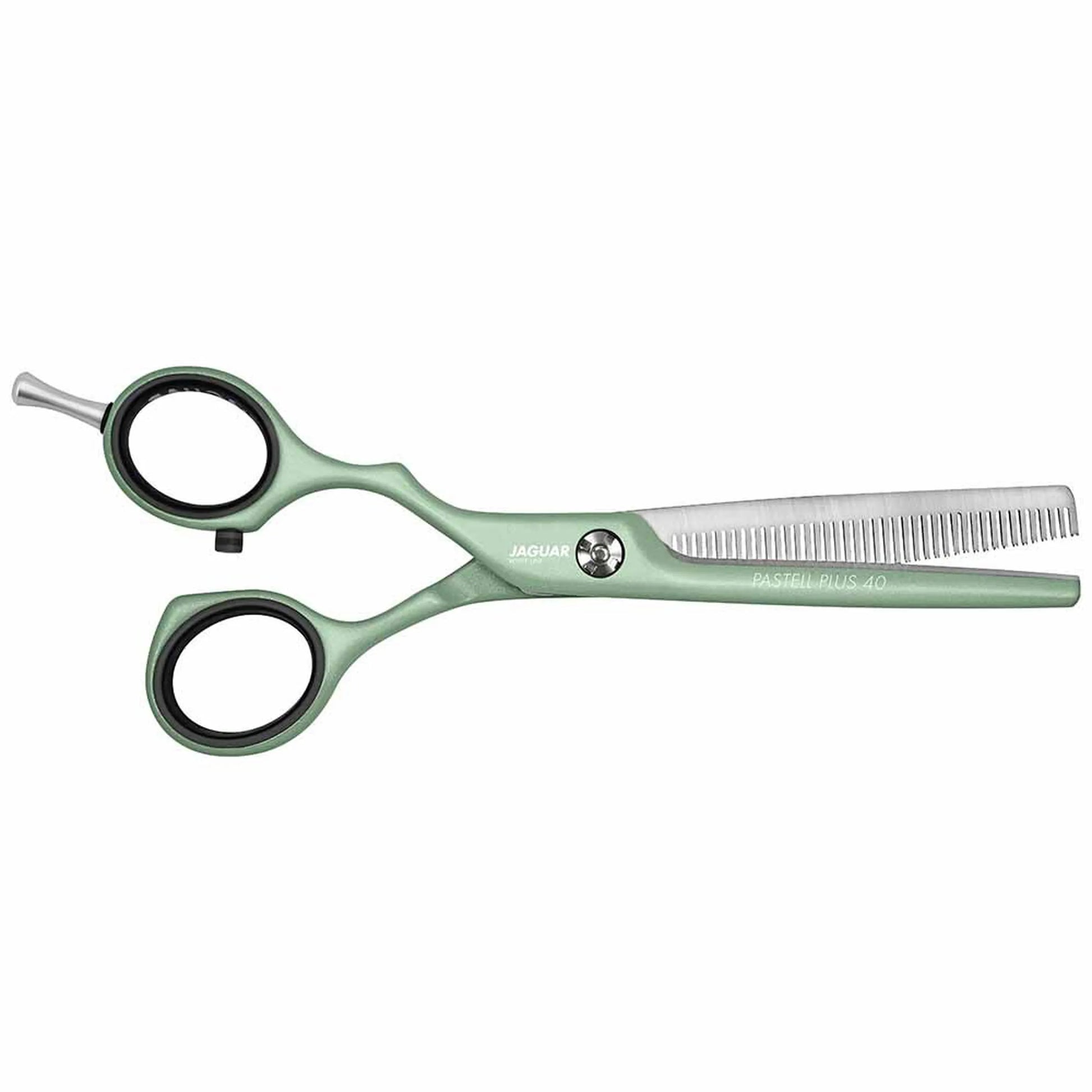 Jaguar Pastell Plus Offset 40 Matcha Green texturing scissors come in the fashionable colour "Matcha". They are reliable modelling scissors for men's and women's haircuts. The Jaguar White Line promises a diverse selection. The scissor models in the Pastell Plus collection are not only colourful, they also have a high-quality metallic coating that offers protection against nickel allergies.